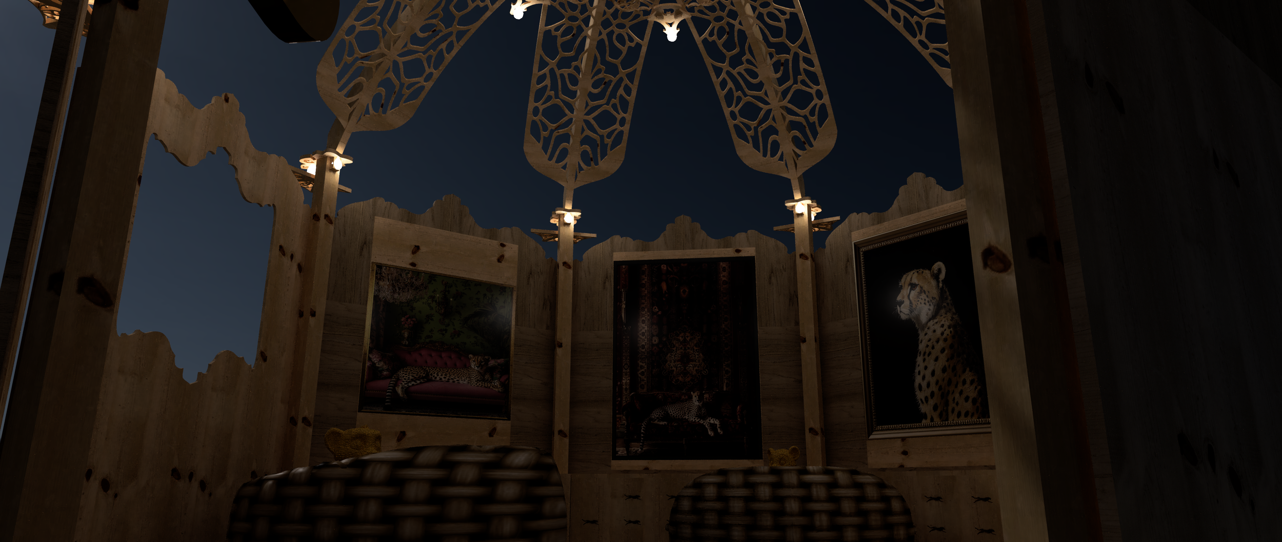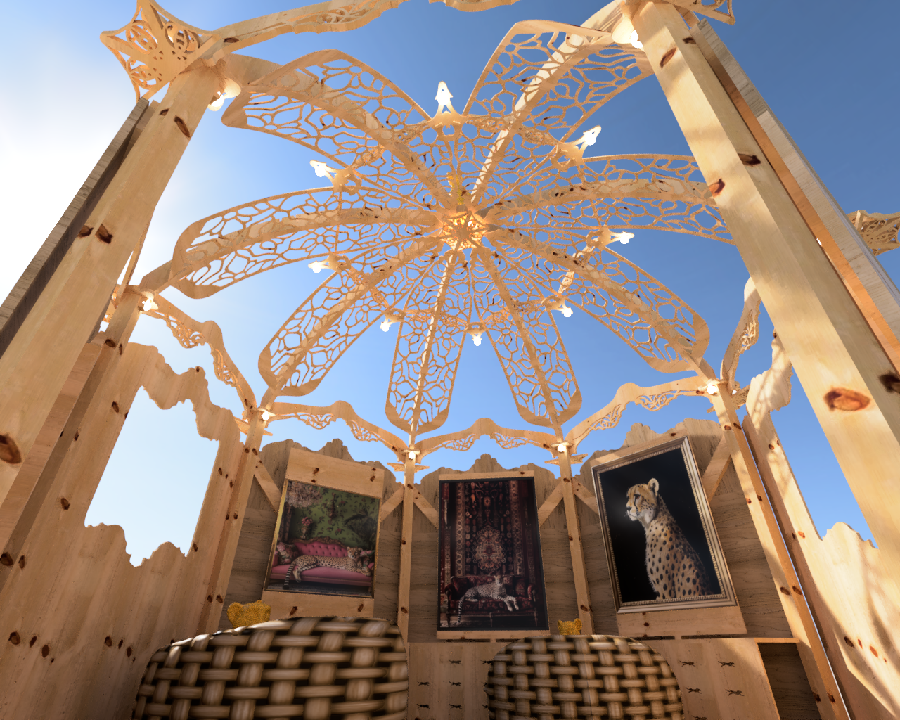 Acinonyx evokes introspection of abundance and mortality simultaneously. The art piece consists of a cheetah running out of an opulent den. The cheetah is a larger than life automaton featuring complex articulated joints that have this animal in a fluid lifelike full sprint when a participant turns a crank. The den is an enclosed wood organic shape adorned with murals. It is enveloped by canvas and latticework that casts dappled shadows. Inside, plush cheetah cubs lounge, accompanied by a soft ambient audio track featuring a recording of a real cheetah purring and a contemplative meditation.